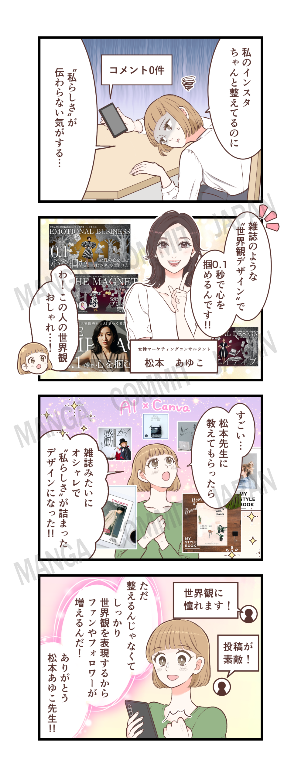 【大人の女性の心を掴むエモーショナルビジネスプロデューサー®女性マーケティングコンサルタント 松本あゆ子様】4コマ漫画